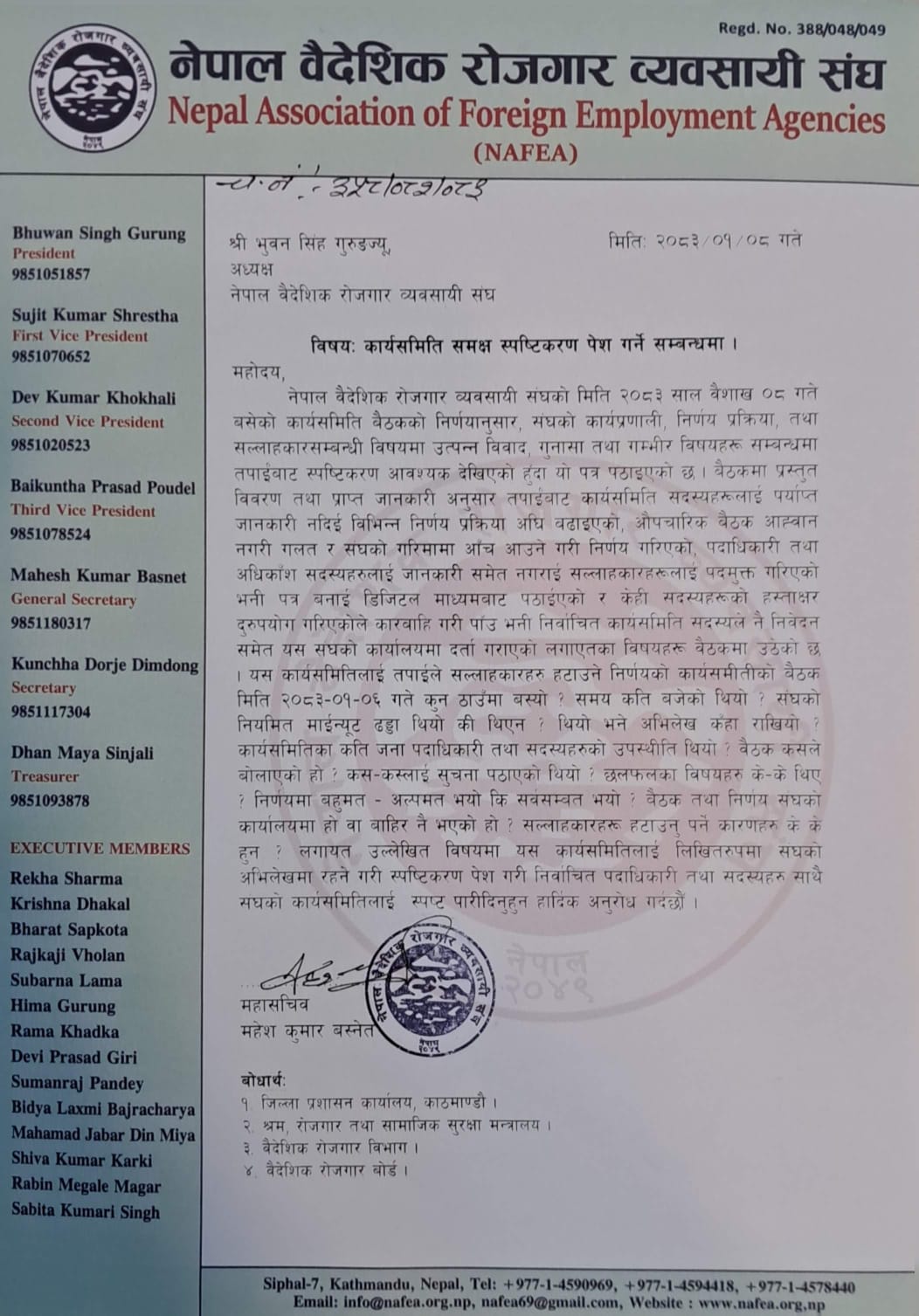 काठमाडौं- नेपाल वैदेशिक रोजगार व्यवसायी संघ भित्रको आन्तरिक विवाद सार्वजनिक भएको छ । महासचिव महेश बस्नेतसहित केही कार्यसमिति सदस्यले अध्यक्ष भुवनसिंह गुरुङसँग लिखित स्पष्टीकरण मागेका छन् ।